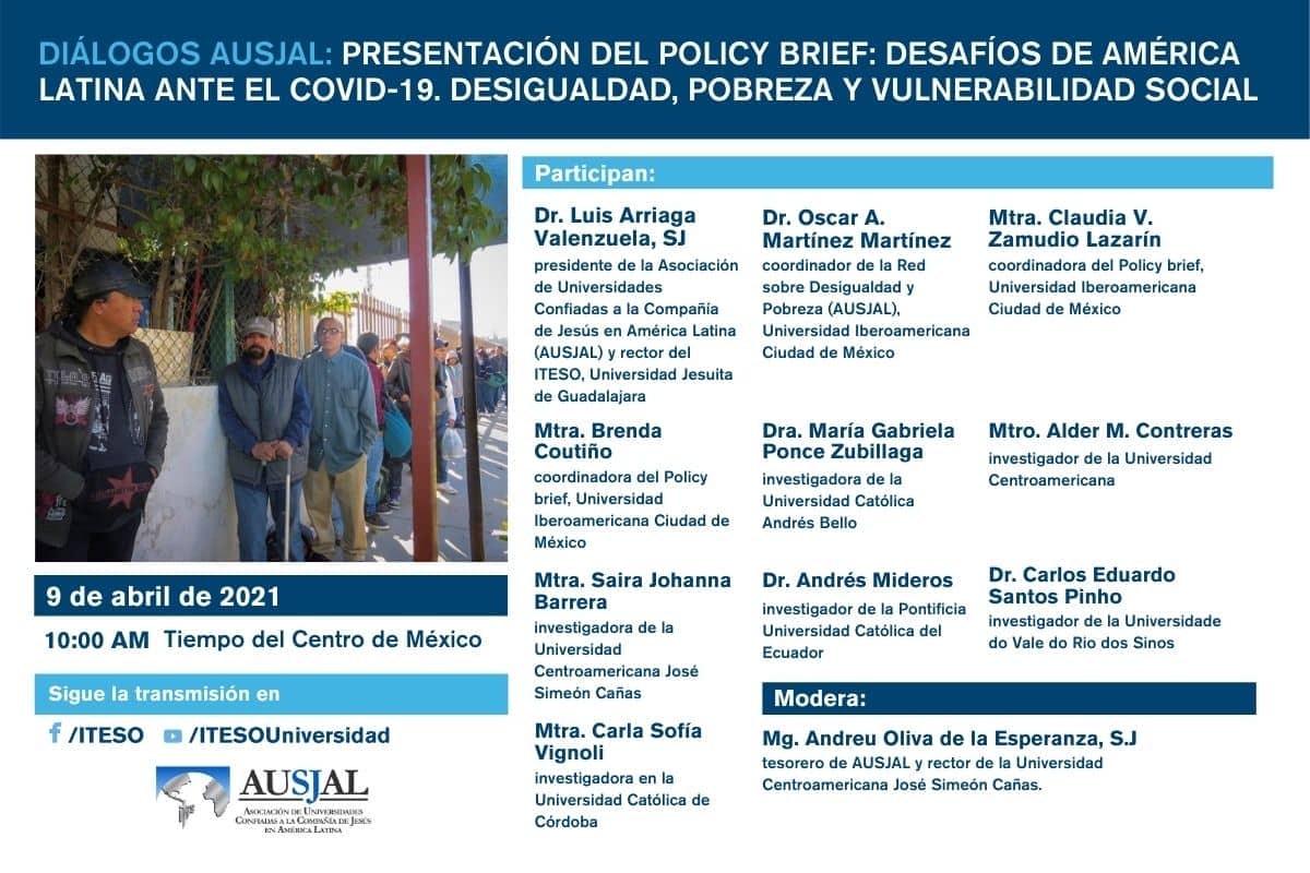 AUSJAL invita a participar del webinar sobre el Policy Brief “Desafíos de América Latina ante el COVID-19. Desigualdad, pobreza y vulnerabilidad social”, en el que investigadores de Venezuela, Nicaragua, México, Ecuador, El Salvador, Brasil y Argentina, describen el contexto que atraviesa cada país como resultado de la pandemia.
