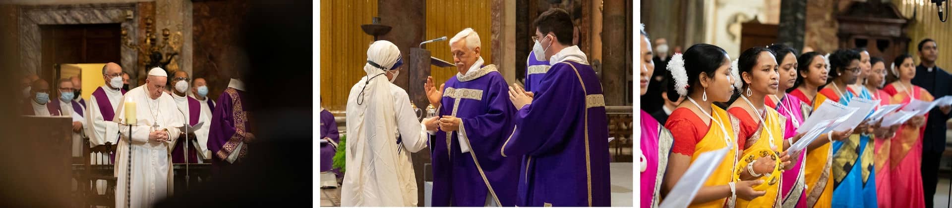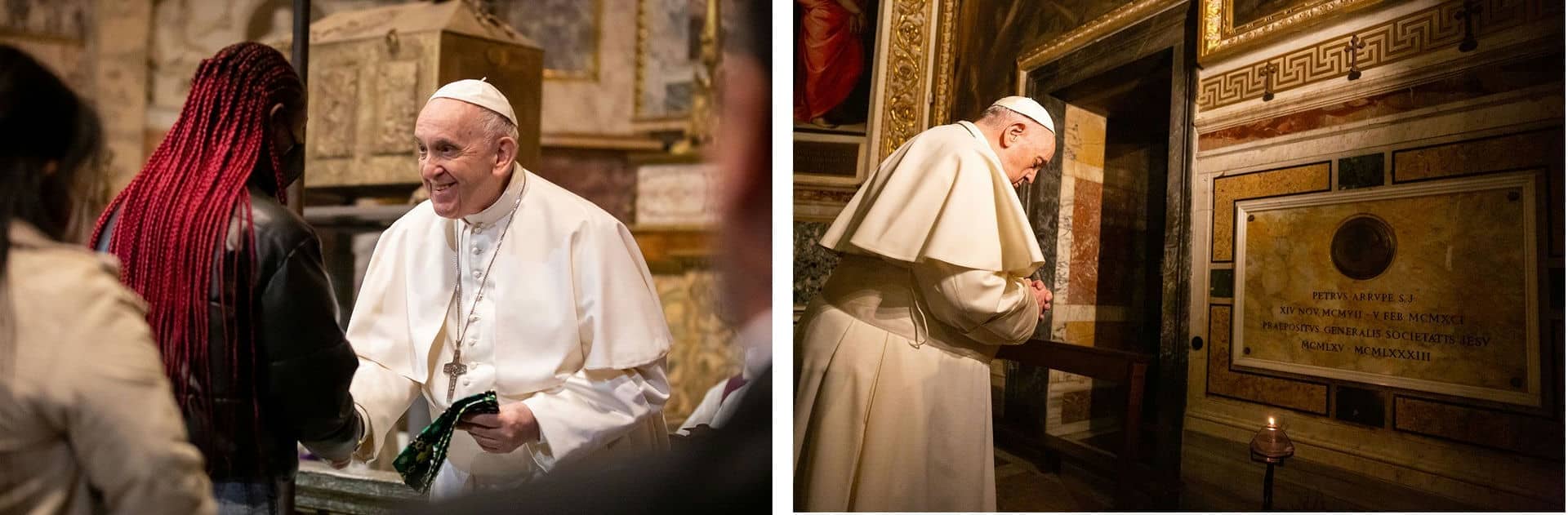 Finalmente, además de las palabras desgarradoras “ten piedad de mí, respóndeme” del salmo cantado por una joven ucraniana, la celebración, presidida por el Superior General de los jesuitas, Arturo Sosa, estuvo marcada por varias cosas significativas: la oración ante la tumba de Ignacio y las reliquias de los otros cuatro santos acompañada por el Arzobispo de Madrid y los Superiores Generales de los Carmelitas y los Oratorianos; la ofrenda hecha por refugiadas del Centro Astalli de Roma al Santo Padre; el maravilloso coro del Collegio del Gesù; y por último, el afecto y la humildad del Papa. En efecto, siendo Pastor Universal de la Iglesia, Francisco se presentó también como hijo espiritual de la Compañía al aniversario de sus dos grandes padres sin perder la ocasión para aludir al tercero de ellos: Pedro Fabro, a quien él mismo canonizó.