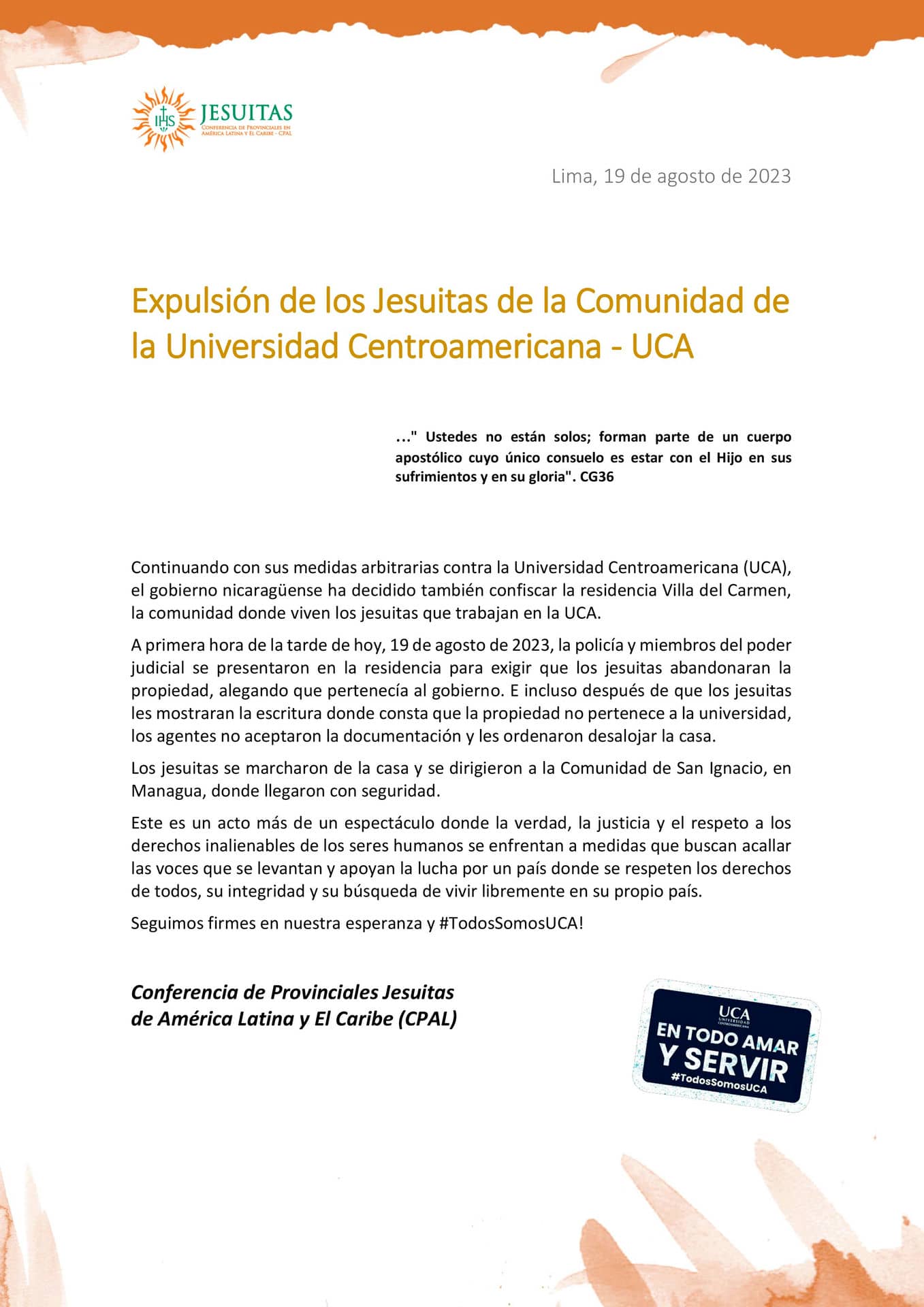 Expulsión de los Jesuitas de la Comunidad de la Universidad Centroamericana - UCA