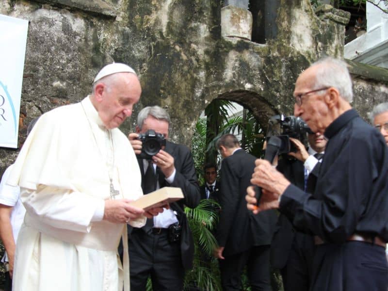 Finalmente, en nombre de la Compañía en Colombia, el P. Tulio Aristizábal, S.J. le hizo entrega del libro El Proceso de canonización de San Pedro Claver y Carlos Ossa, S.J. le entregó la camiseta y la cartilla de la Ruta Verde del Papa Francisco, una iniciativa social y ambiental del Santuario de San Pedro Claver en Cartagena a la luz de la carta encíclica Laudato Sí.