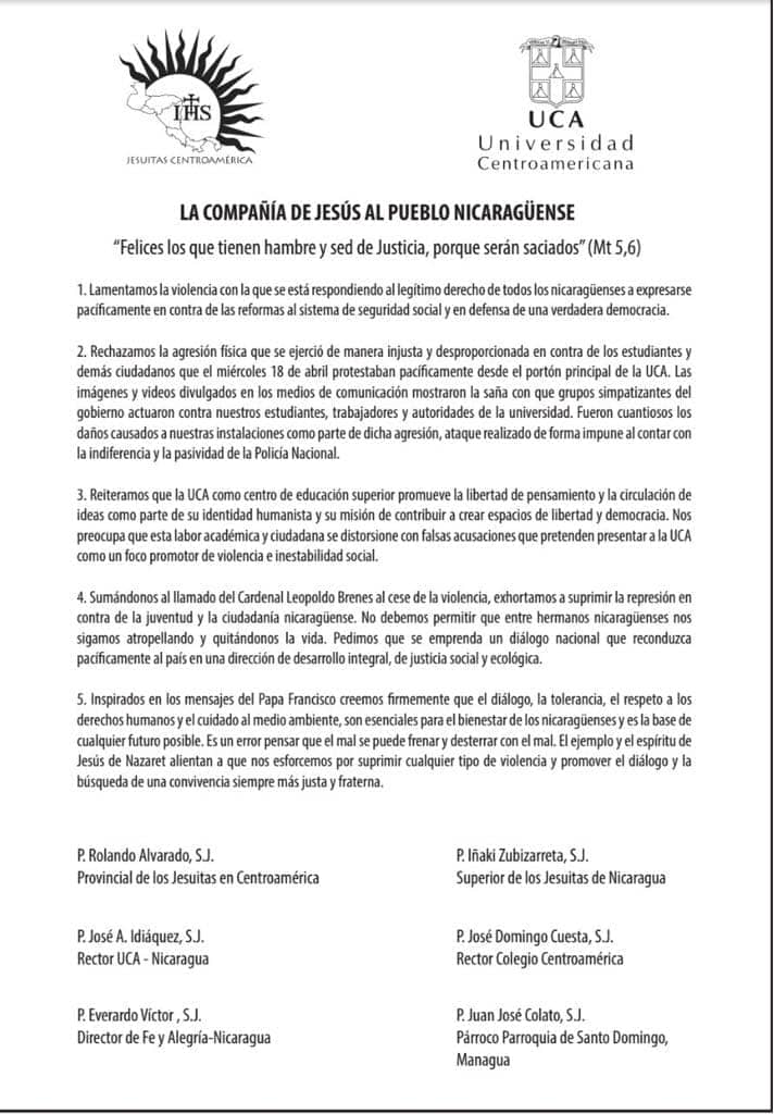 Manifestamos nuestra más cercana solidaridad con nuestros compañeros jesuitas y colaboradores de la obra apostólica de la Compañía de Jesús que, junto con el pueblo nicaragüense,siguen siendo fieles a los ideales de igualdad, fraternidad, solidaridad y justicia que otrora hicieron grande este país.