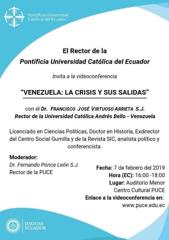 Compartimos una invitación que realiza la Pontificia Universidad Católica del Ecuador para la videoconferencia: Venezuela: "La crisis y sus salidas" con el Dr. Francisco José Virtuoso Arrieta S.J., Rector de la Universidad Andrés Bello de Venezuela.