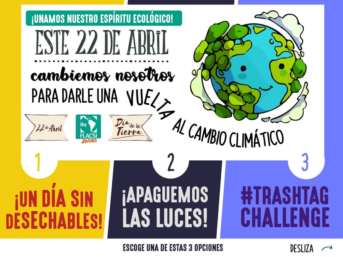 Impulsados por el compromiso y creatividad de estos grupos de estudiantes, desde FLACSI-Jóvenes nace esta propuesta de acción conjunta, para que el próximo lunes 22 de abril, Día Internacional de la Tierra, ¡unamos nuestro espíritu ecológico! Y cambiemos nosotros para darle una vuelta al cambio climático.