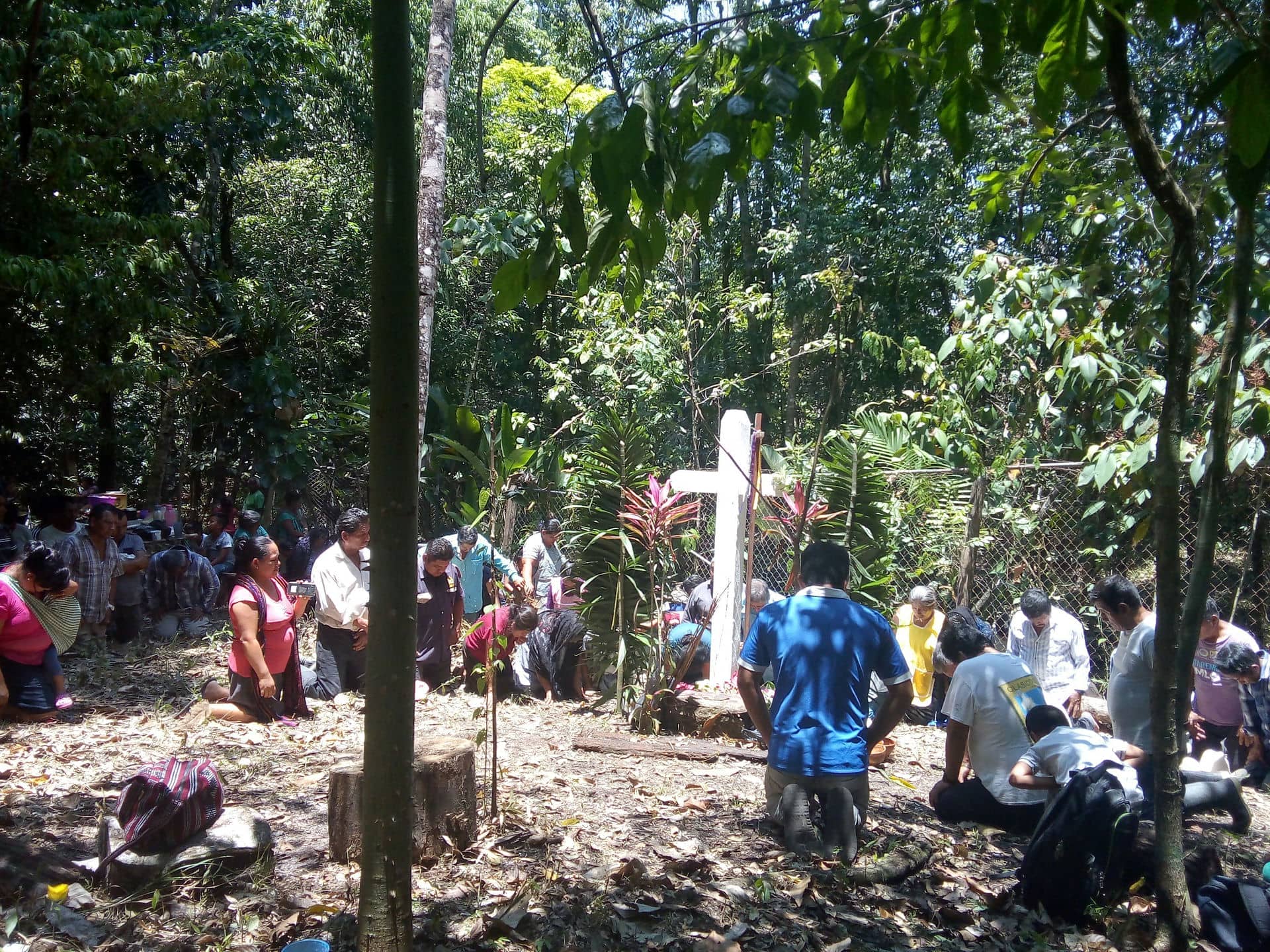 Cuando ya está preparado el lugar y adornada la cruz, los principales, que son los ancianos que guían la comunidad, llaman para hacer la oración y ofrendar a la tierra. Encienden las velas y preparar unos vasos con aguardiente que colocan al pie de la cruz. Todos hincados alrededor de la cruz, animados por el principal mayor, hacemos oración en voz alta, pero sin gritar, tranquilamente. Muchas de las personas, al estar haciendo la oración, gesticulan y mueven los brazos, tal como lo hacen cuando hablan con una persona. El principal con un ayudante va rociando la tierra con el aguardiente, hablándole a la tierra, como a nuestra madre, y al espíritu que la cuida (Ahau). Pasan varios minutos y las personas se van callando hasta que, finalmente, el principal da por terminada la oración y todos se inclinan para besar la tierra.