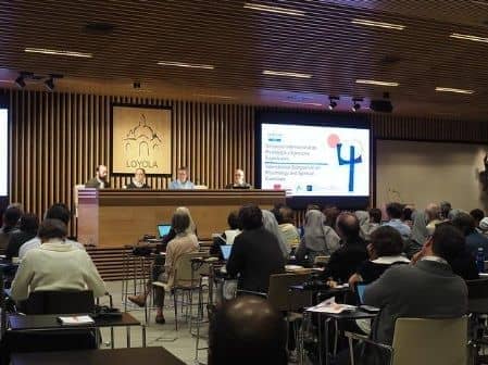 La perspectiva de género fue protagonista después del descanso a través de las presentaciones de Elizabeth Liebert que hiló su ponencia en torno a seis recomendaciones para quienes ofrezcan tandas de Ejercicios a mujeres: “conócete a ti mismo, sé humilde, toma seriamente las anotaciones 15 y 18, escucha contemplativamente, contrasta o comprueba lo que escuchas, y presupón la mejor intención a tu ejercitante”. Seguidamente, Francisco José Ruiz Pérez SJ, Margaret Scott y Sylvie Robert plantearon, en mesa redonda, cuestiones como si hay una perspectiva femenina de la espiritualidad ignaciana, si existen mociones en femenino o si habría que organizar también una mesa redonda sobre mociones en masculino.