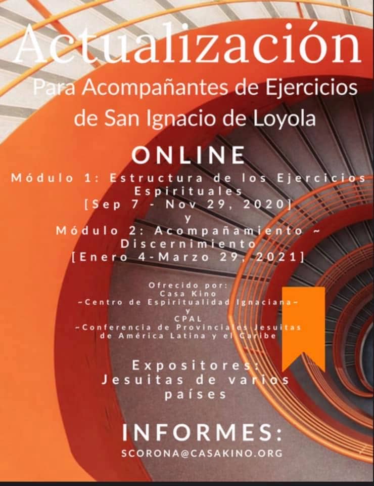 A lo largo y ancho del mundo hay muchos acompañantes de ejercicios espirituales que llevan un tiempo sirviendo a la comunidad, a la Iglesia y a la Compañía a través de este trabajo de acompañar a otros en la experiencia de los ejercicios, por lo que la Casa Kino, el Centro Ignaciano de Espiritualidad de San Diego, California y la CPAL (Conferencia de Provinciales de América Latina y del Caribe) ofrecen completamente en línea el curso de 'Actualización para acompañantes de EE de San Ignacio de Loyola" que iniciará en el mes de septiembre de del presente año.