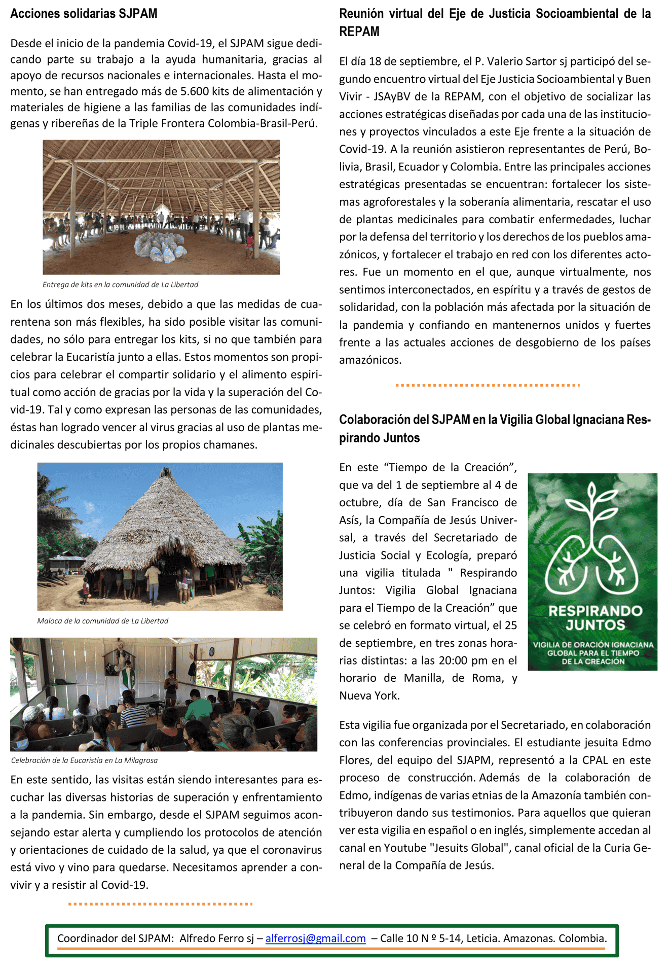 Durante este tiempo de pandemia, a pesar de que el equipo del SJPAM ha estado confinado la mayor parte del tiempo en su residencia en Leticia, poco a poco ha ido retomando sus salidas a las diversas comunidades indígenas, con el fin de apoyar acciones de asistencia humanitaria y acompañar las celebraciones.