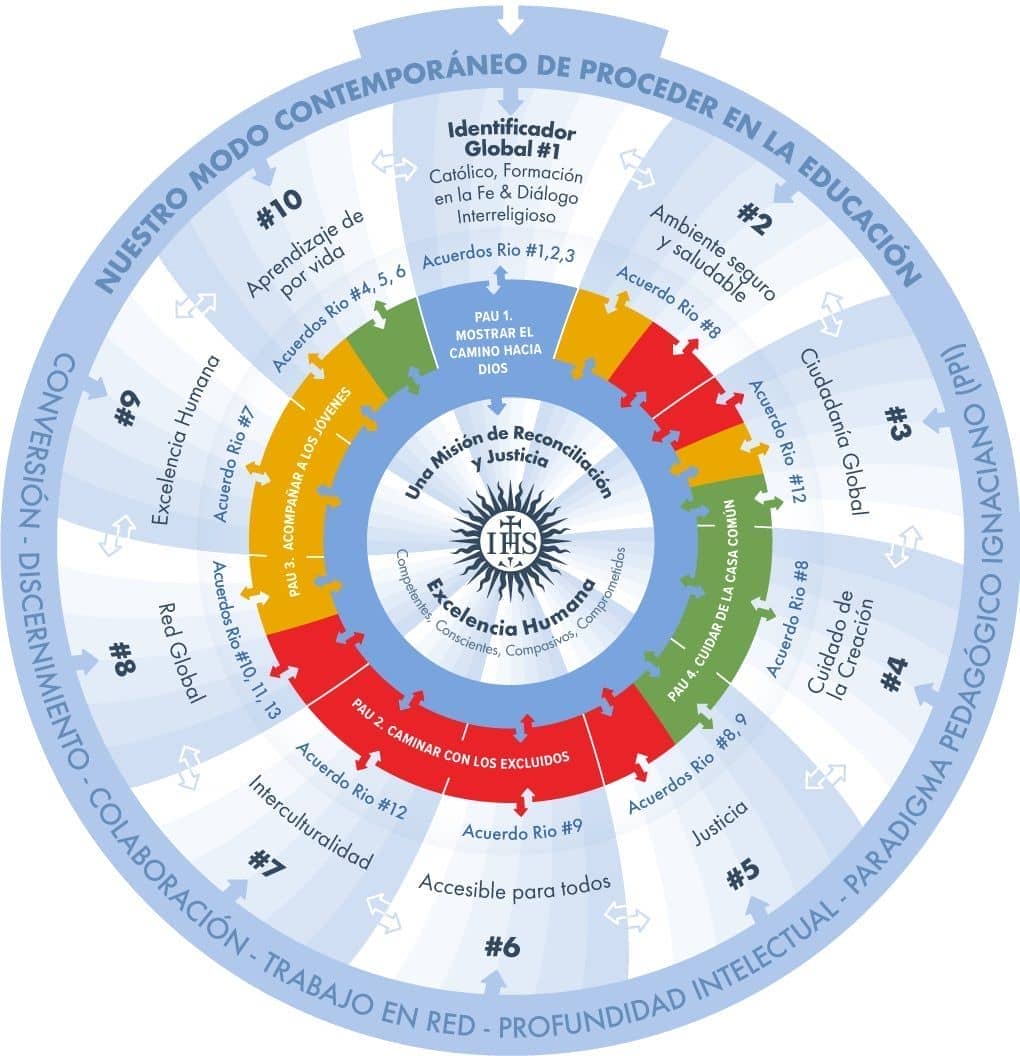 Las otras tres PAUs, “Caminar junto a los pobres”, “Colaborar en el cuidado de la casa común” y “Acompañar a los jóvenes en la creación de un futuro esperanzador”, conforman el siguiente círculo y conectan con las 13 acciones de Río de Janeiro que muestran caminos concretos para implementar estas preferencias. Dichos acuerdos están a su vez relacionados con los 10 identificadores globales de Una Tradición Viva, que representan los rasgos más significativos de la educación integral como es concebida hoy en nuestros colegios.