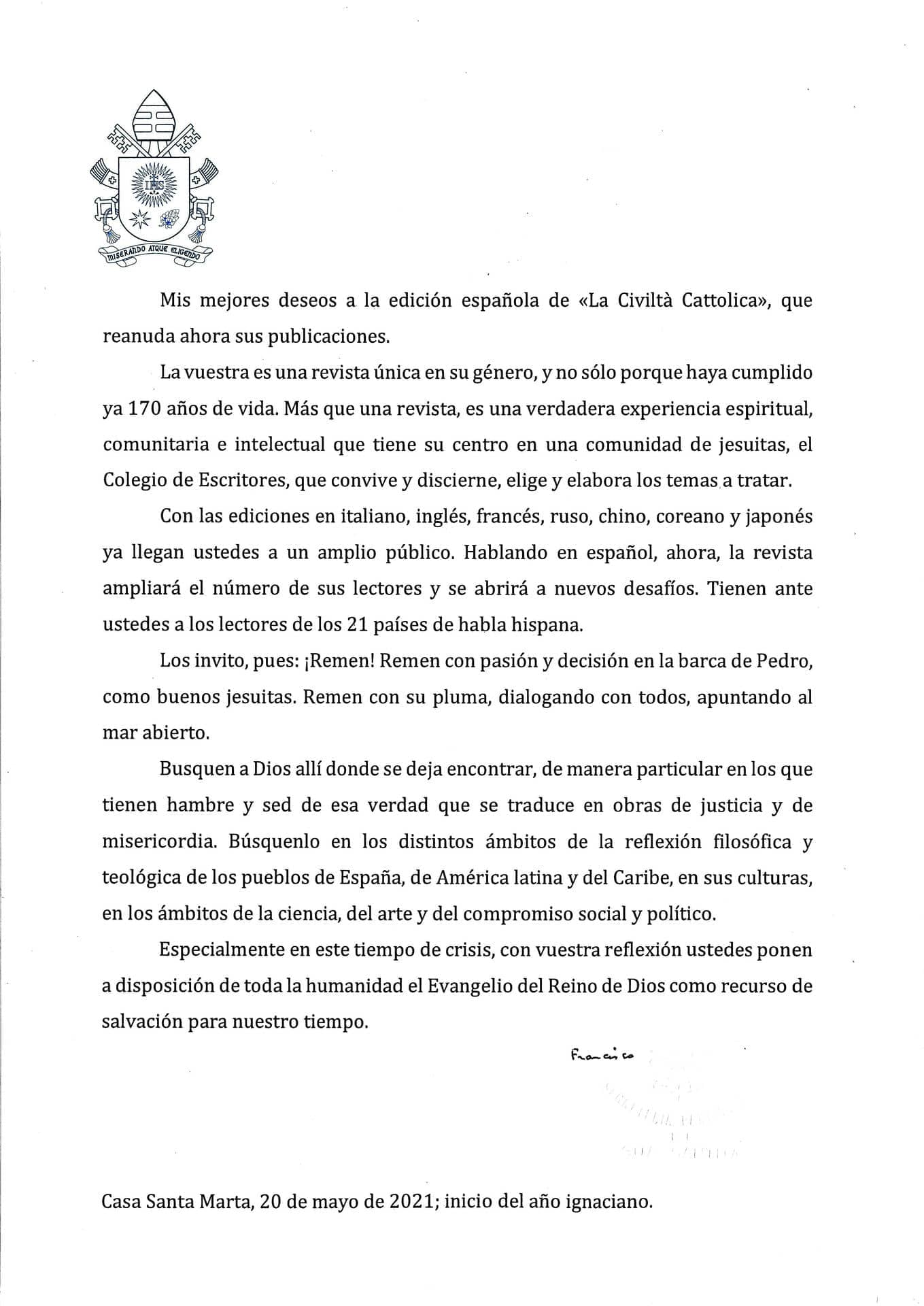«La vuestra es una revista única en su género», escribe el Pontífice a los padres escritores y a los colaboradores de La Civiltà Cattolica, y agrega: «Más que una revista, es una verdadera experiencia espiritual, comunitaria e intelectual».