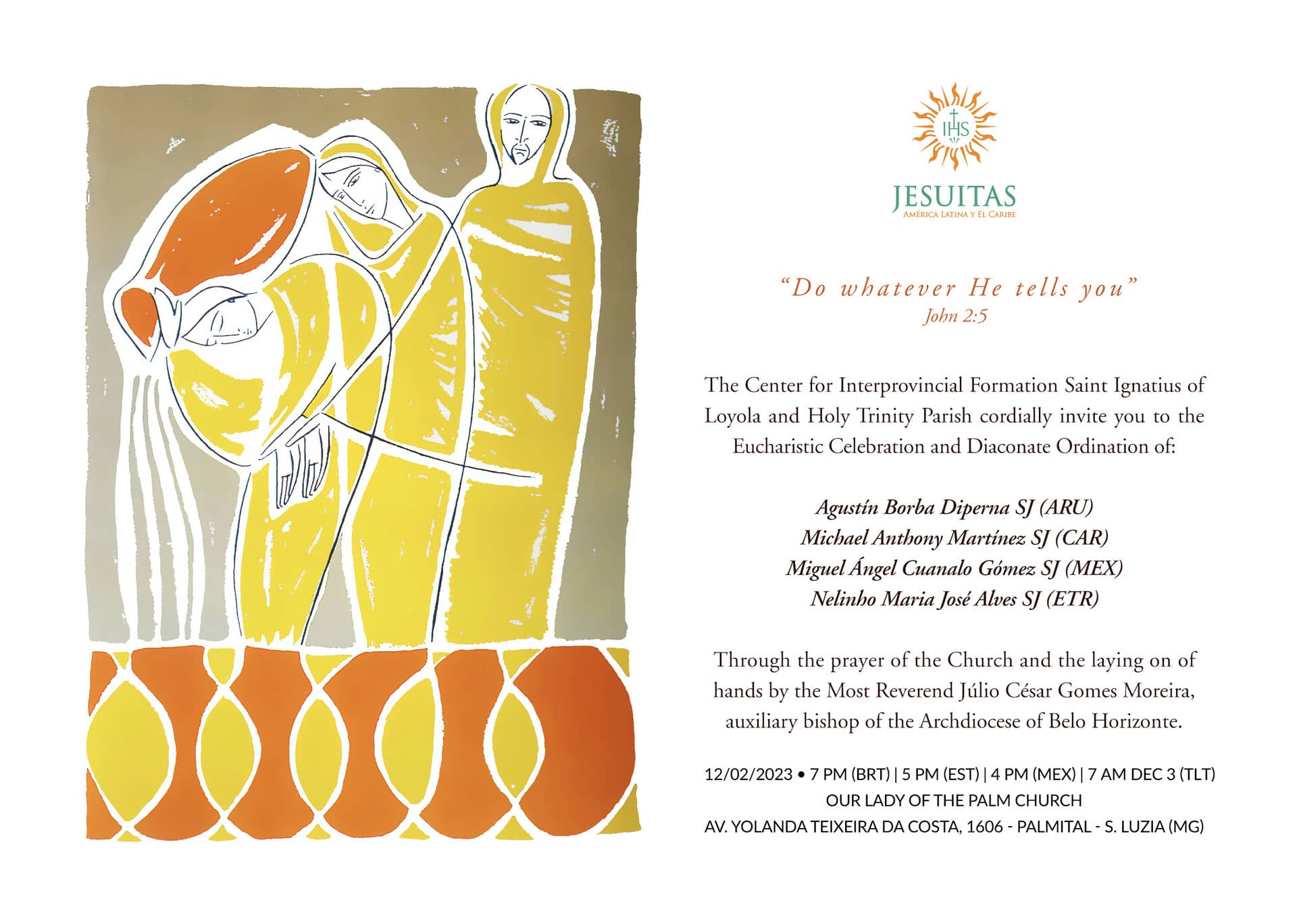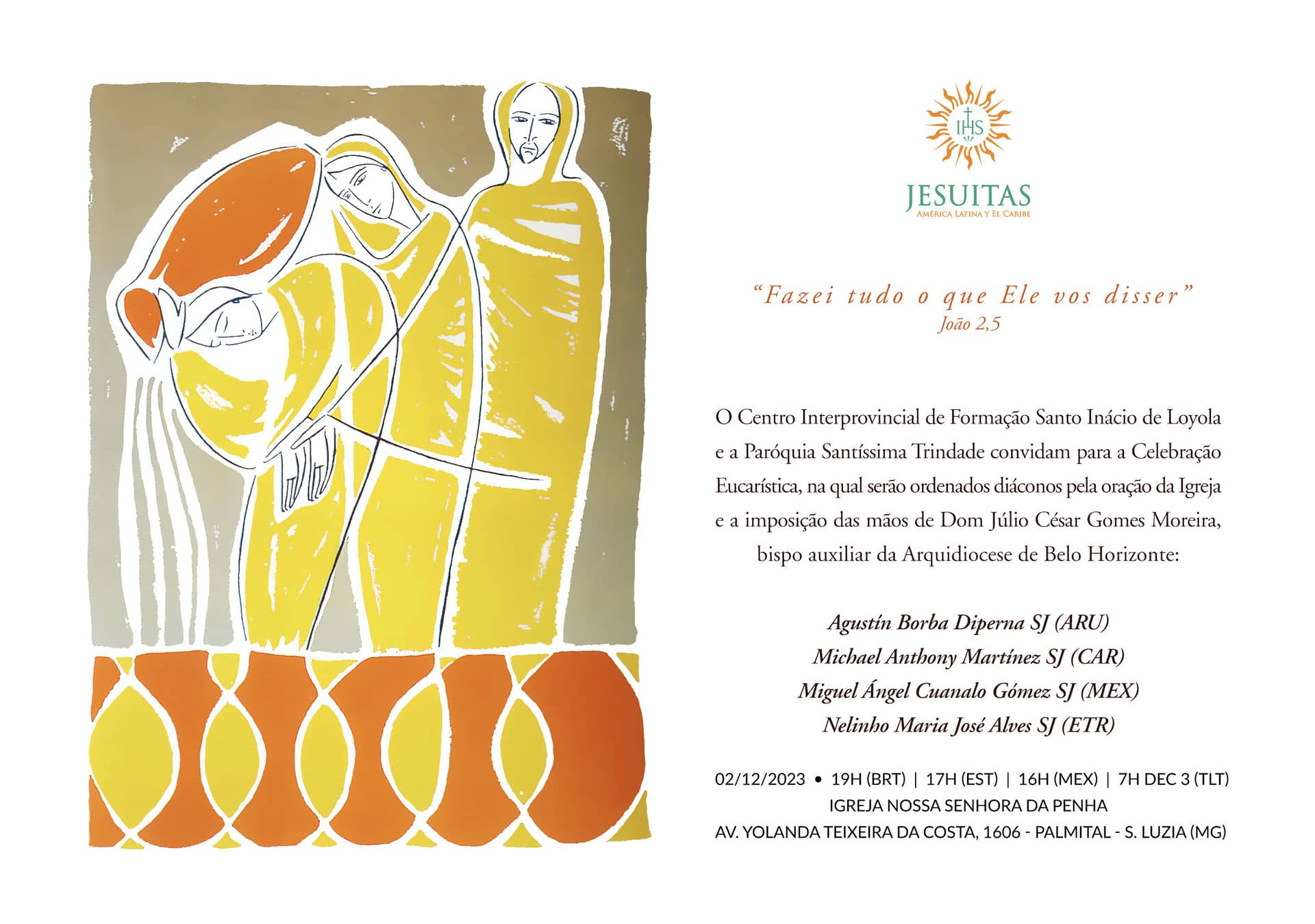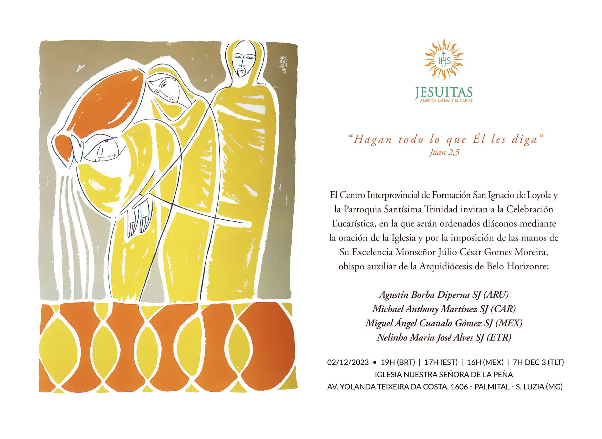 Con gratitud al Señor y movidos por una intensa alegría, el Centro Interprovincial de Formación San Ignacio de Loyola (dependiente de la CPAL) y la Parroquia Santísima Trinidad invitan a la Celebración Eucarística en la que serán ordenados diáconos por la oración de la Iglesia y la imposición de las manos de Mons. Júlio César Gomes Moreira, obispo auxiliar de la Arquidiócesis de Belo Horizonte, nuestros compañeros: Agustín Borba Diperna, SJ (Uruguay, Provincia ARU); Michael Anthony Martínez, SJ (EE.UU., Provincia CAR); Miguel Ángel Cuanalo Gómez, SJ (México, Provincia MEX) y Nelinho Maria José Alves, SJ (Timor Oriental, Provincia ETR), el día 2 de diciembre de 2023, a las 19:00 (hora de Brasilia, BR), en la Iglesia de Nuestra Señora de Penha, ubicada en la Av. Yolanda Texeira da Costa, 1606 - Palmital - Santa Luzia (MG).