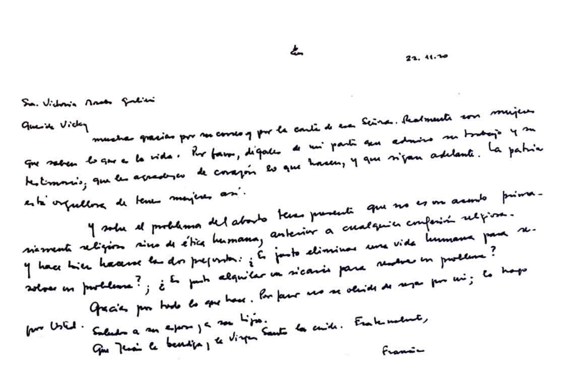 Francisco continuó el texto fechado el 22 de noviembre de 2020: "Y sobre el problema del aborto tener presente que no es un asunto primariamente religioso sino de ética humana, anterior a cualquier confesión religiosa".