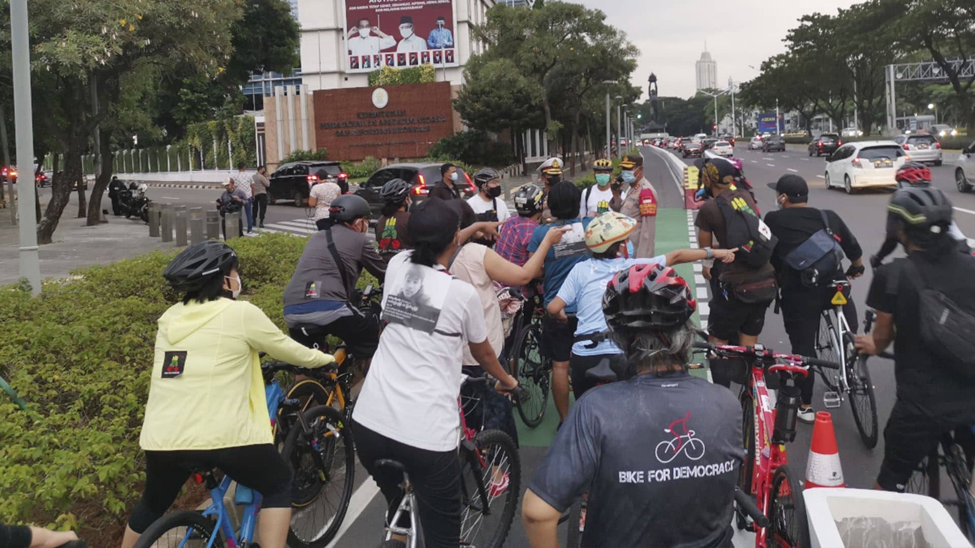 Además de la oración de vigilia interreligiosa, el 24 de abril también se celebró una manifestación en bicicleta para protestar pacíficamente por la presencia del líder golpista de Myanmar, el general Min Aung Hlaing, en la cumbre de la ASEAN. Unos 70 ciclistas se unieron a la huelga denominada “ Gowes (bicicleta) por la democracia”, que comenzó en la oficina de la Fundación de Ayuda Legal de Indonesia y culminó en el edificio de la Secretaría de la ASEAN donde se estaba llevando a cabo la cumbre. Los guardias policiales detuvieron a los ciclistas tres veces y surgió una ligera tensión entre la policía y los manifestantes cuando se acercaron al lugar de la cumbre.