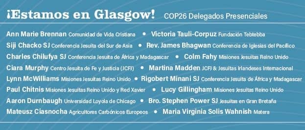A través de la Red Ecojesuit, la Compañía de Jesús y la familia ignaciana estarán activamente presentes en Glasgow, elevando las voces de los pobres y los marginados ante los responsables de la toma de decisiones. Alrededor de 15 delegados que representan a Ecojesuit y a la Compañía de Jesús estarán en Glasgow participando en varios eventos y programas. Muchos más seguirán los eventos en línea desde todo el mundo.