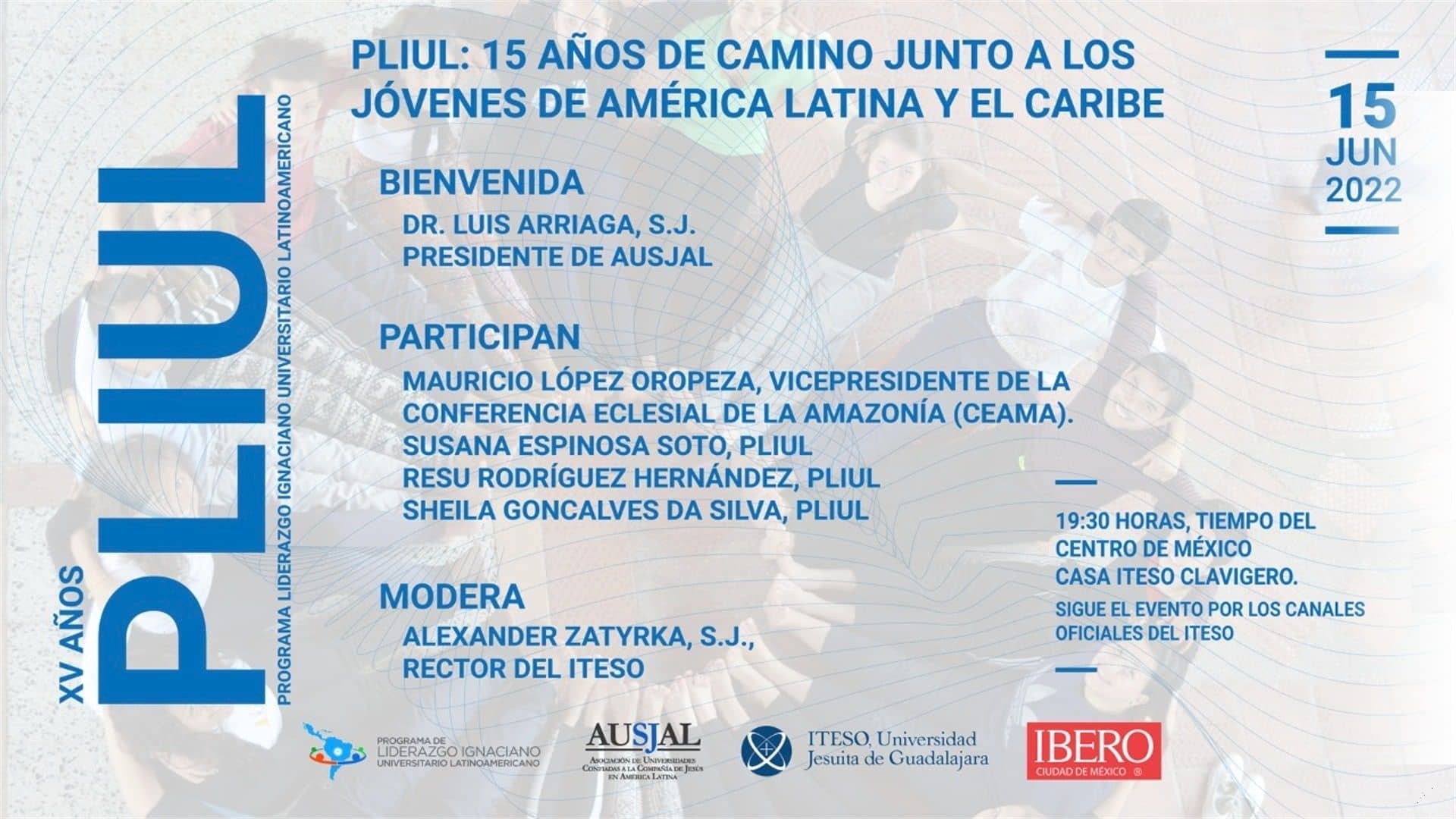 La conferencia tendrá como invitados a Luis Arriaga SJ (Presidente de AUSJAL), Mauricio López (Vicepresidente de la Conferencia Eclesial de la Amazonía - CEAMA), Susana Espinosa Soto (Egresada de PLIUL Ecuador), Resu Rodríguez Hernández (PLIUL ITESO) y Sheila Goncalves Da Silva (PLIUL).