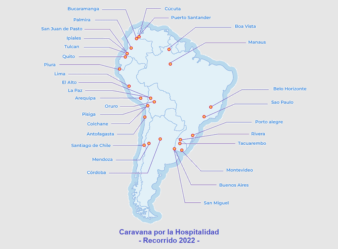 Entre el 15 de agosto y el 8 de septiembre de 2022, la Caravana por la #hospitalidad va recorriendo Uruguay y Argentina, en un itinerario articulado con el Servicio Jesuita a Migrantes SJM ARU. Llegando a la localidad uruguaya de Rivera (frontera con Brasil), y pasará por Tacuarembó, Rocha y Montevideo para continuar hacia Argentina, donde tendrá paradas en la ciudad de Buenos Aires, San Miguel (en el conurbano bonaerense), Córdoba y Mendoza.