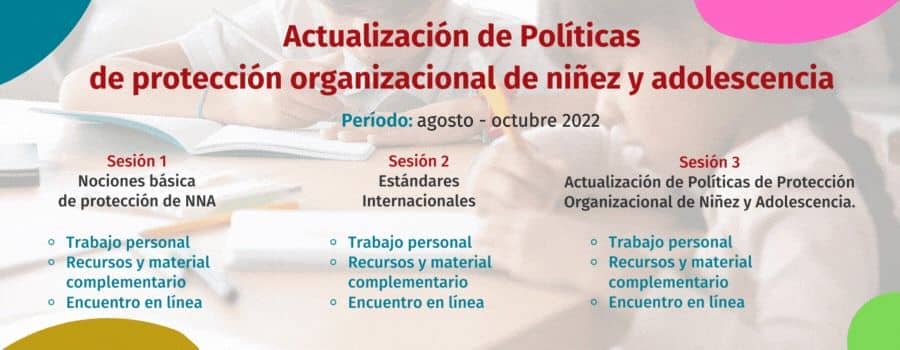 Esta acción formativa hace parte de la oferta en la categoría de cursos especiales. El contenido ha sido estructurado en 3 sesiones, en las que se abordan temáticas relacionadas a nociones básicas sobre protección de la niñez y adolescencia, estándares internacionales y actualización de Políticas de Protección Organizacional de Niñez y Adolescencia.
