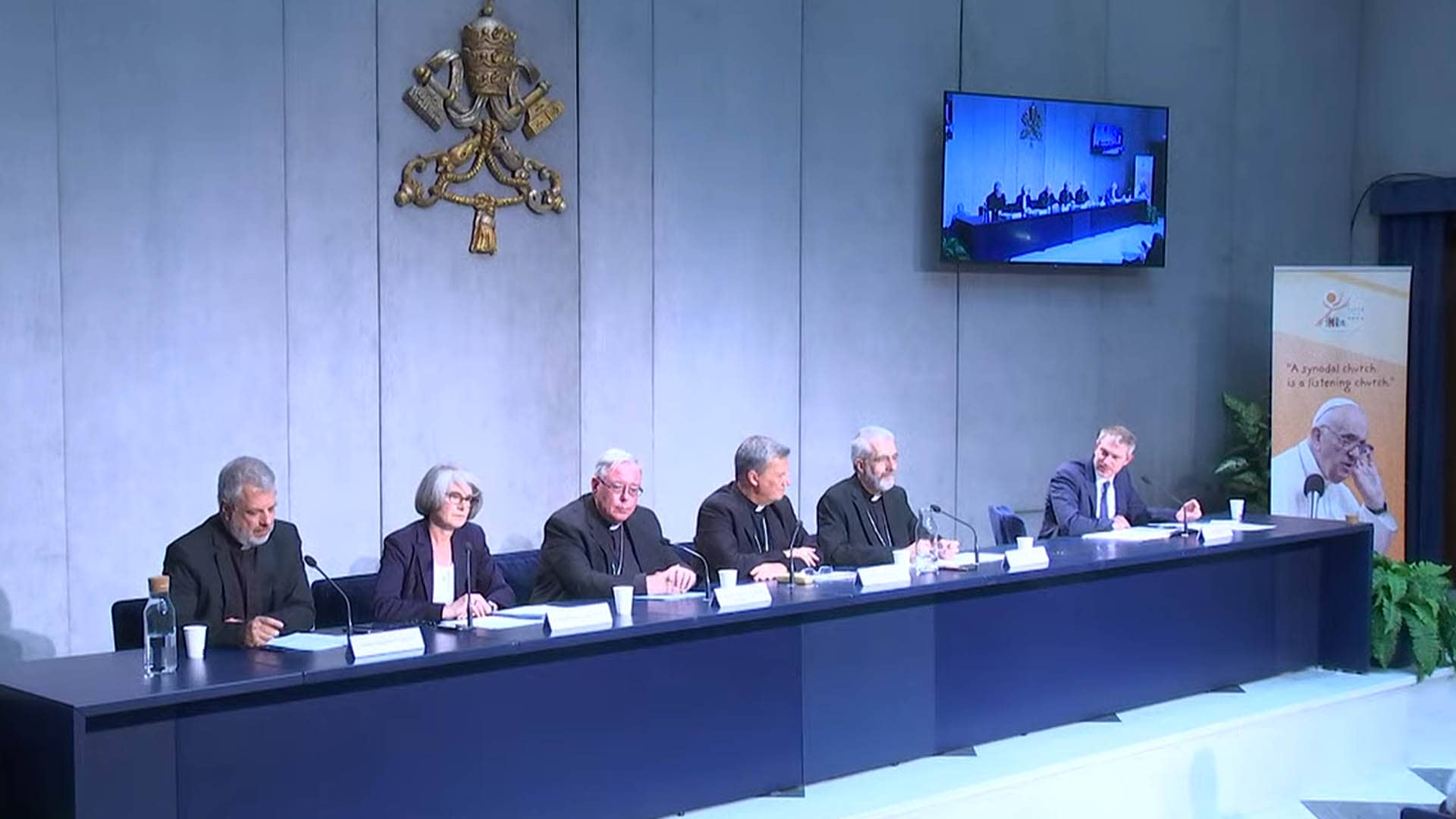 Un cartel vertical con la imagen del Papa con la mano en la oreja y las palabras en inglés "A synodal Church is a Church that listenens" (Una Iglesia sinodal es una Iglesia que escucha) ha destacado en la conferencia en la Sala de Prensa del Vaticano, donde tuvo lugar la presentación de la segunda etapa del camino sinodal el viernes 26 de agosto, en presencia de un numeroso público de periodistas.