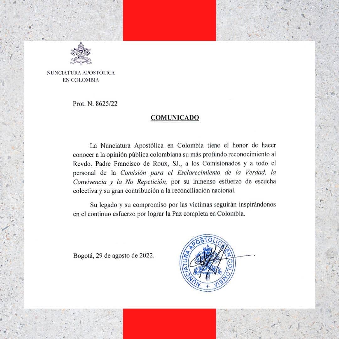 Mons. Luis Mariano Montemayor, Nuncio Apostólico de Colombia, ha enviado una misiva en el da “a conocer a la opinión pública colombiana su más profundo reconocimiento” al sacerdote jesuita y a todo su equipo habida cuenta de “su legado y su compromiso por las víctimas seguirán inspirándonos en el continuo esfuerzo por lograr la paz completa en Colombia”.