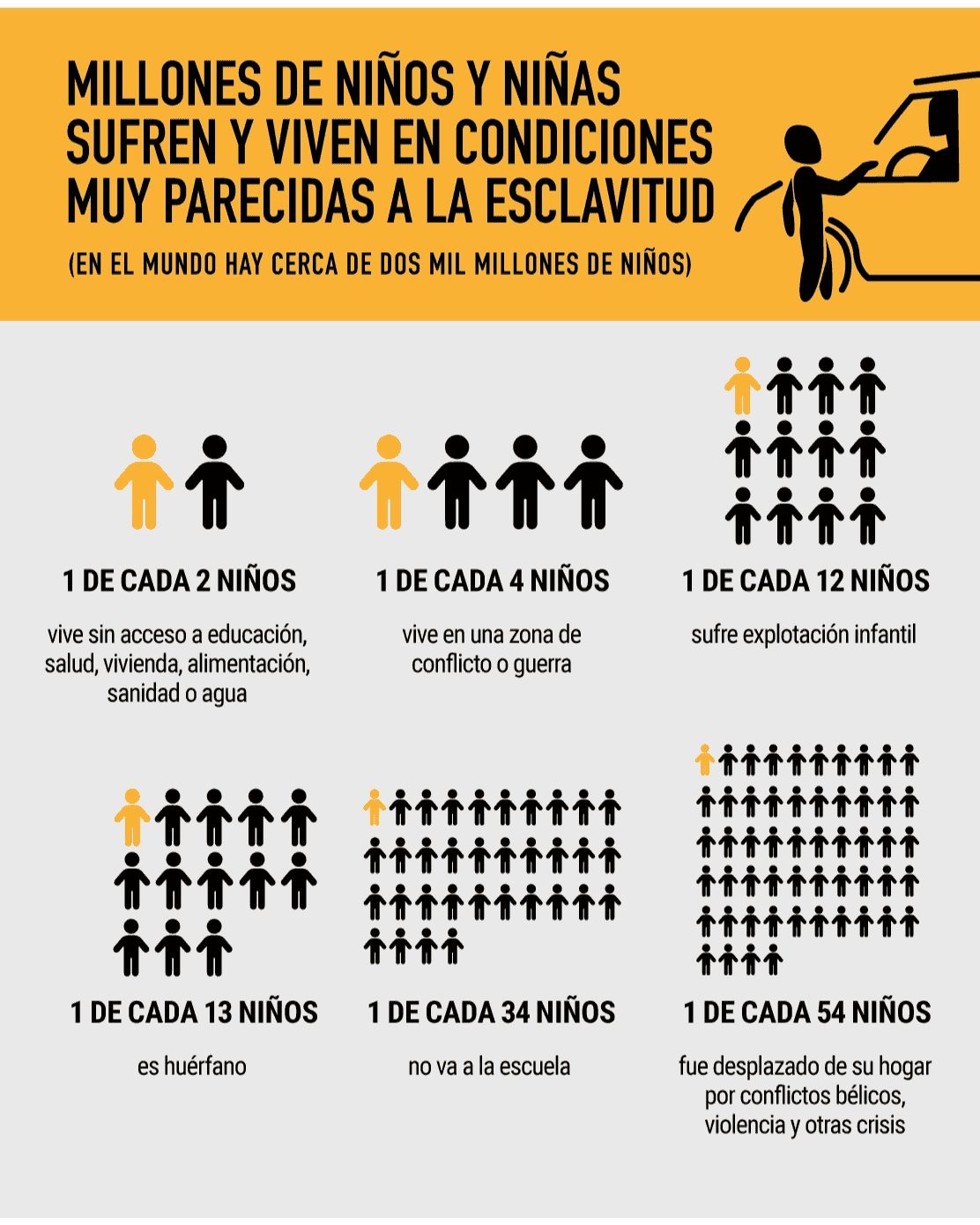 Para enmarcar el trasfondo del mensaje de este mes, basta con recordar algunas referencias mundiales. UNICEF subraya que 1000 millones de niños en todo el mundo viven en una pobreza multidimensional (no tienen acceso a la educación, la salud, la vivienda, la alimentación, la sanidad o al agua) y estima que 153 millones de niños son huérfanos. Por otro lado, el Alto Comisionado para los Derechos Humanos de la ONU manifestó en una carta reciente que “a finales del año pasado, más de 450 millones de niños —uno de cada seis— vivían en una zona de conflicto, la cifra más alta en 20 años. Una cifra récord de 36,5 millones de niños fueron desplazados de sus hogares como consecuencia de conflictos, violencia y otras crisis”.