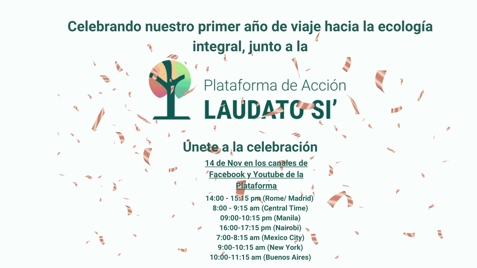 La transmisión se realizará en vivo a través del canal de Youtube: Laudato Si Action Platform o de la cuenta de Facebook: Plataforma de Acción Laudato Si'