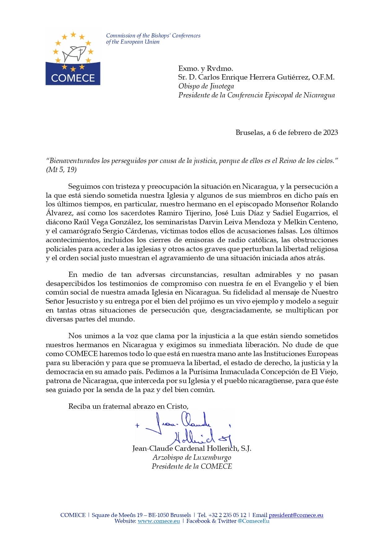 El Presidente de la Comisión de las Conferencias Episcopales de la Unión Europea (COMECE), Cardenal Jean-Claude Hollerich SJ., expresa la solidaridad de los Obispos de la UE con la Iglesia Católica en Nicaragua que enfrenta una profunda angustia debido a la persecución del Estado. Cardenal Hollerich: “Liberen a Mons. Rolando Álvarez y los demás detenidos”.