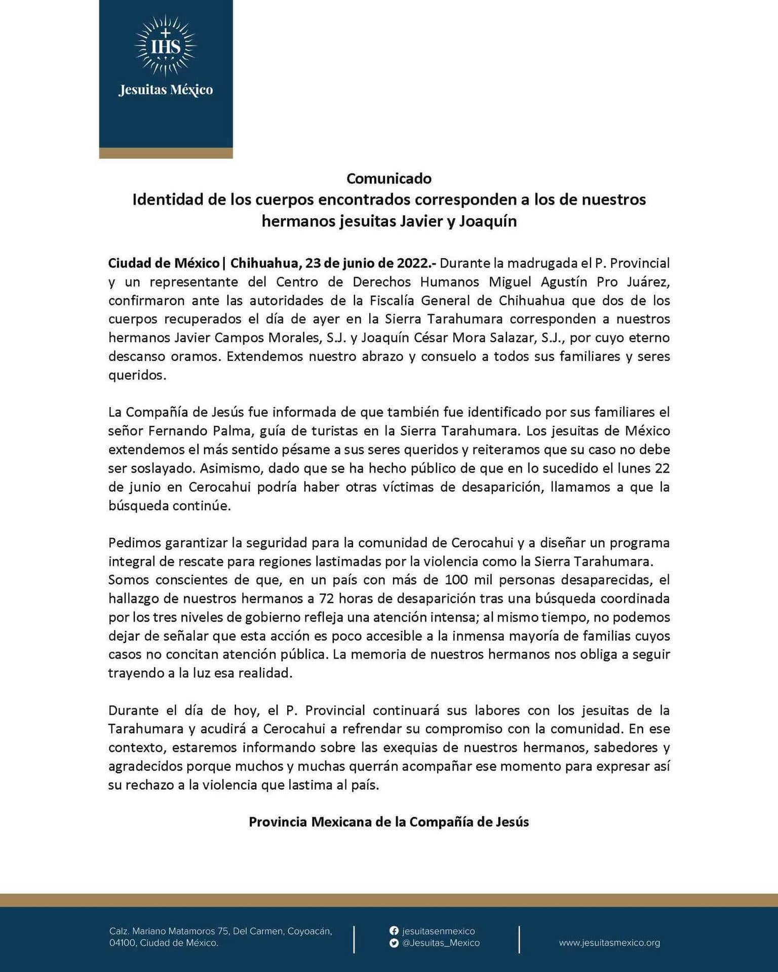 La Compañía de Jesús fue informada de que también fue identificado por sus familiares el señor Fernando Palma, guía de turistas en la Sierra Tarahumara. Los jesuitas de México extendemos el más sentido pésame a sus seres queridos y reiteramos que su caso no debe ser soslayado. Asimismo, dado que se ha hecho público de que en lo sucedido el lunes 22 de junio en Cerocahui podría haber otras víctimas de desaparición, llamamos a que la búsqueda continúe.
