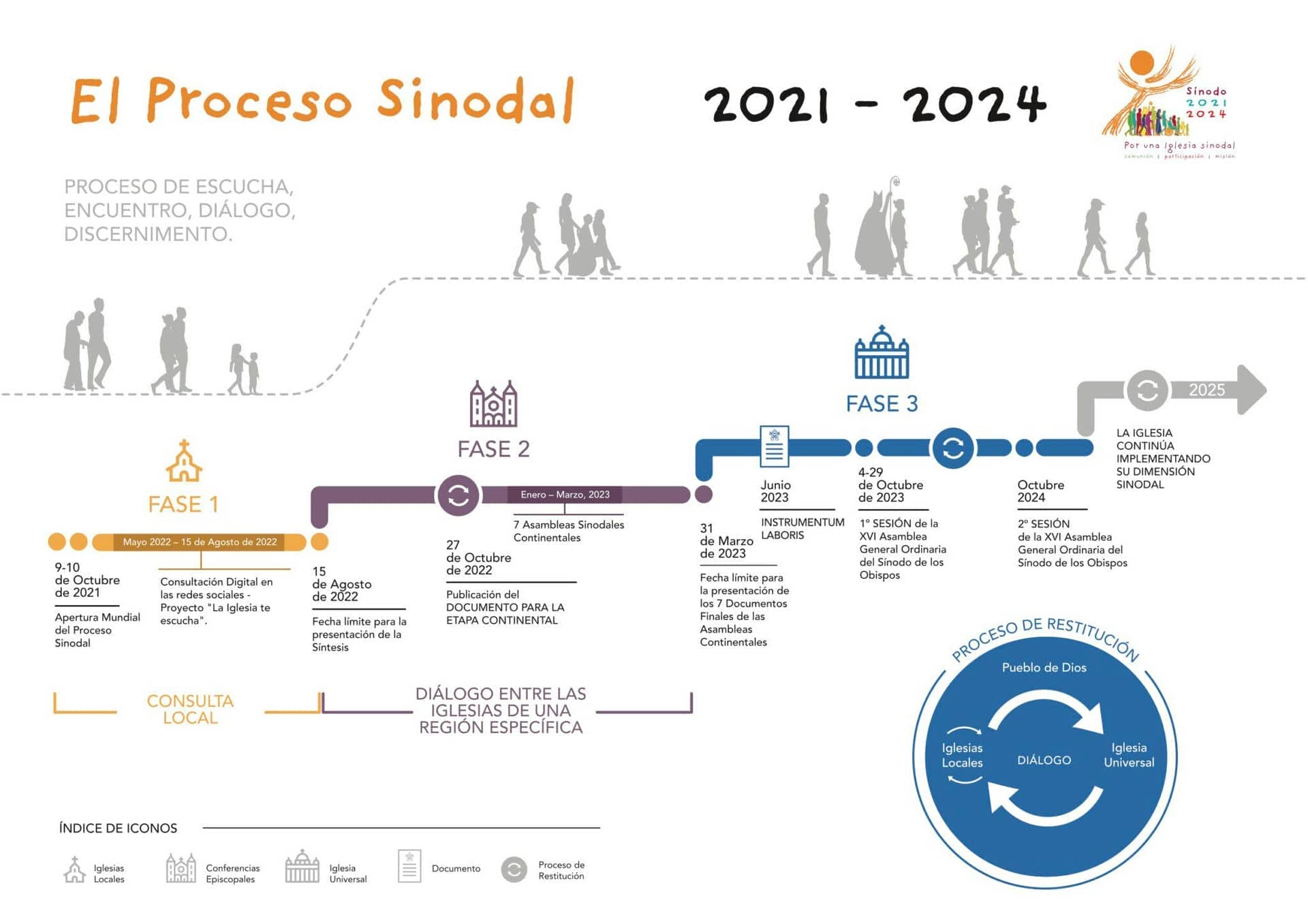 - Fase Conferencias Episcopales / Sínodos de Iglesias Orientales. Un periodo de discernimiento de los pastores reunidos en asamblea (Conferencia Episcopal). Redacción de síntesis, enviada a la Secretaría General del Sínodo (hasta del abril 2022).